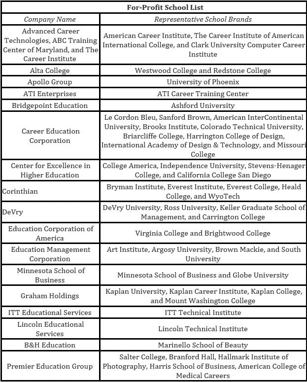 The loan was used to attend one of the for-profit schools included on a list below; or