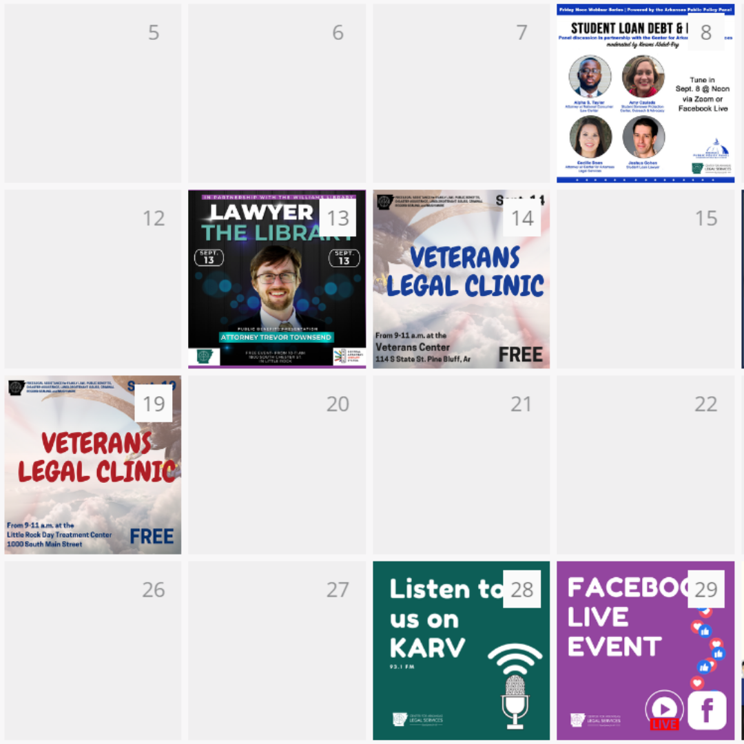 The Center for Arkansas Legal Services is always out in the community setting up free clinics with fellow community partners around the state to reach Arkansans. We do a few things each month in different areas to meet our clients, such as: