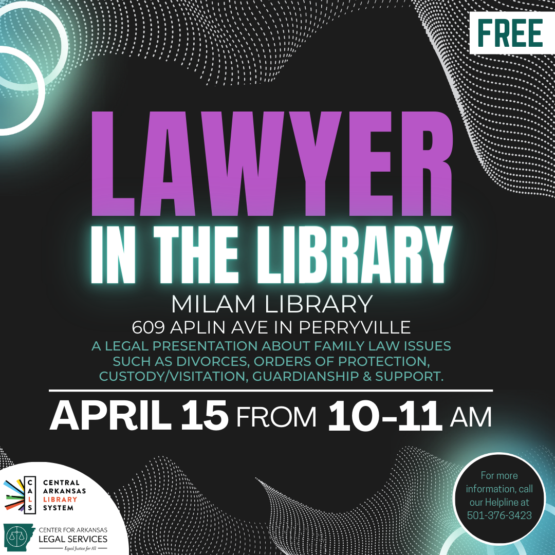Join us for "Lawyer in the Library" at 10 am on April 15 as we talk about Family law Issues such as Divorces, Orders of Protection, Custody/Visitation, Guardianship & Support. This event will be held at 609 Aplin Ave in Perryville, Arkansas, at the Milam Library.