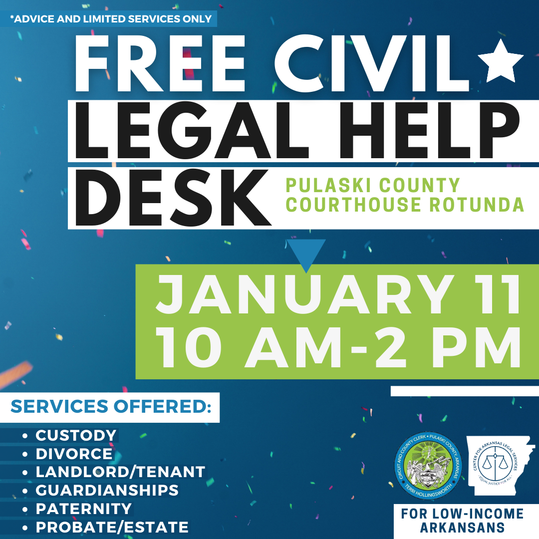 Come on down from 10 am- 2 pm at the Pulaski County Courthouse on Jan. 11 and discover how we can help you face your civil legal issues. Let us help you for FREE with custody, divorce, landlord/tenant issues, guardianships, paternity, and probate/estate planning at this month's Legal Help Desk.