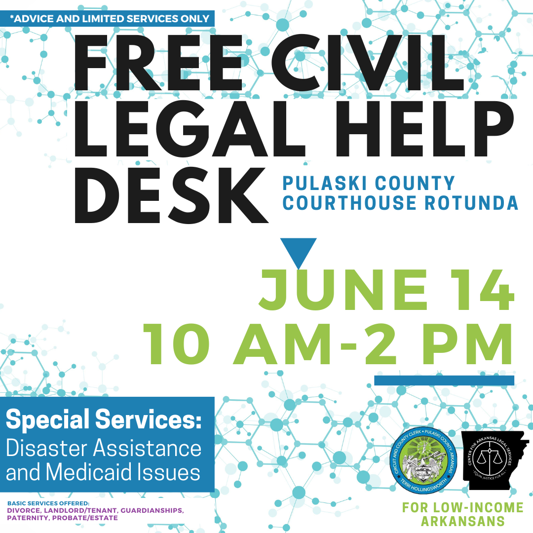 Come on down from 10 am- 2 pm at the Pulaski County Courthouse on June 14 and discover how we can help with your civil legal issues. Let us help you for FREE with disaster assistance, Medicaid changes, divorce, landlord/tenant issues, guardianships, paternity, and probate/estate planning at this month's Legal Help Desk.
