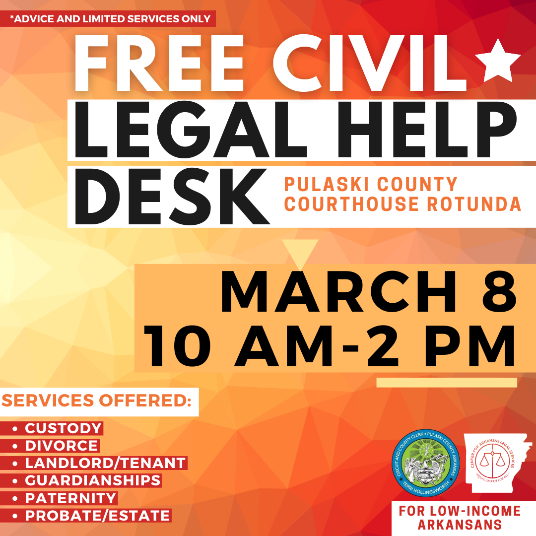 Come on down from 10 am- 2 pm at the Pulaski County Courthouse on March 8 and discover how we can help you face your civil legal issues. Let us help you for FREE with custody, divorce, landlord/tenant issues, guardianships, paternity, and probate/estate planning at this month's Legal Help Desk.