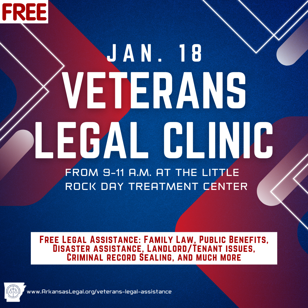 Join Us in Little Rock, Arkansas, for our FREE Veterans Legal Clinic on Jan. 18 from 9-11 a.m. at 1000 South Main Street (Little Rock Day Treatment Center)