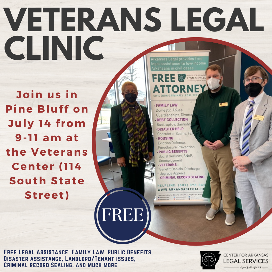 Join Us in Pine Bluff, Arkansas, for our FREE Veterans Legal Clinic on July 14 from 9-11 a.m. at the New Veterans Center located at 114 S. State Street