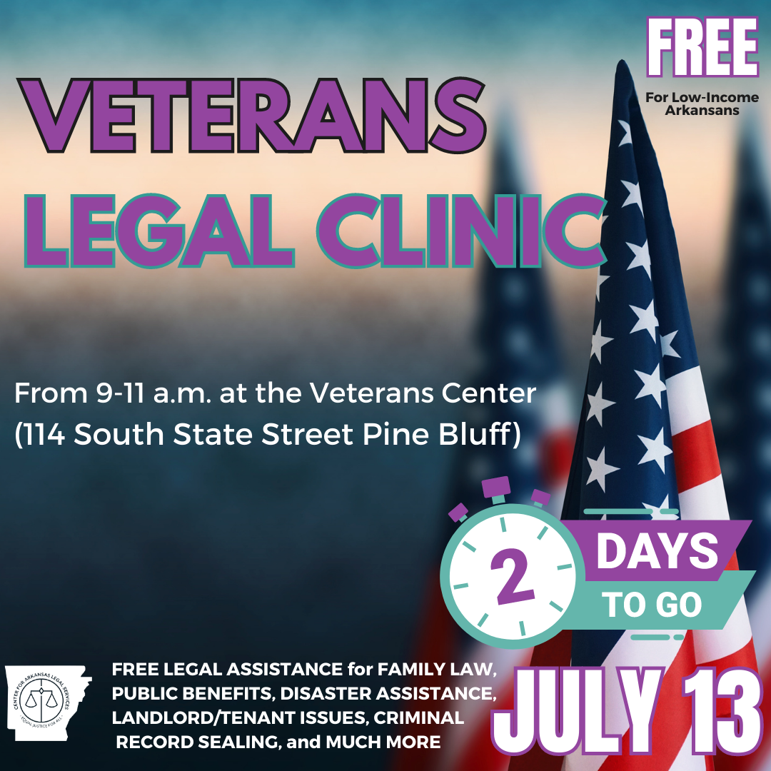 Join Us in Pine Bluff for our FREE Veterans Legal Clinic on July 13 from 9-11 am at the Veterans Center located at 114 South State Street