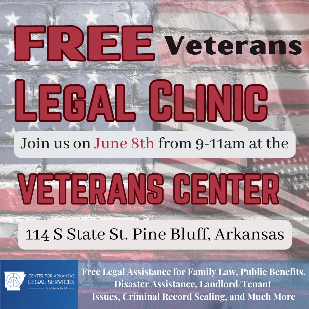 Join Us in Pine Bluff for our FREE Veterans Legal Clinic on June 8 from 9-11 am at the Veterans Center located at 114 S. State Street