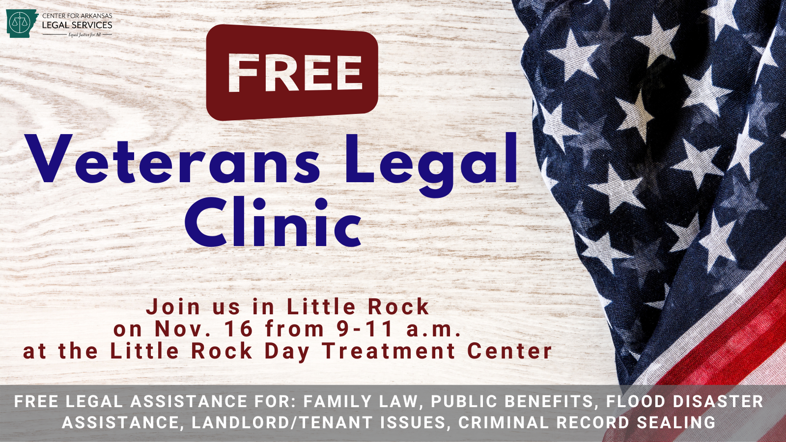 Join Us in Little Rock, Arkansas for our upcoming Veterans Legal Clinic. It will be held on Nov. 16 from 9-11 a.m., located at 1000 South Main Street (at the Veterans Day Treatment Center).