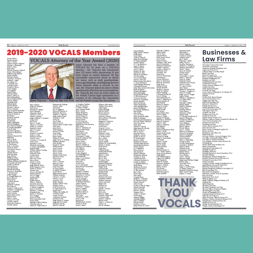 James Tripcony has been a member of VOCALS for 24 years. As a VOCALS attorney, Mr. Tripcony has volunteered over 232 hours while representing 25 pro bono clients in central Arkansas. He has successfully represented clients in family law issues, such as adult guardianships, minor guardianships, and litigating divorces where domestic abuse is present. In one case, Mr. Tripcony helped an aunt to obtain guardianship of her four nieces and nephews. Mr. Tripcony has been an active leader in the Pulaski County legal community as a member of the Arkansas Bar Association and the Pulaski County Bar Association.