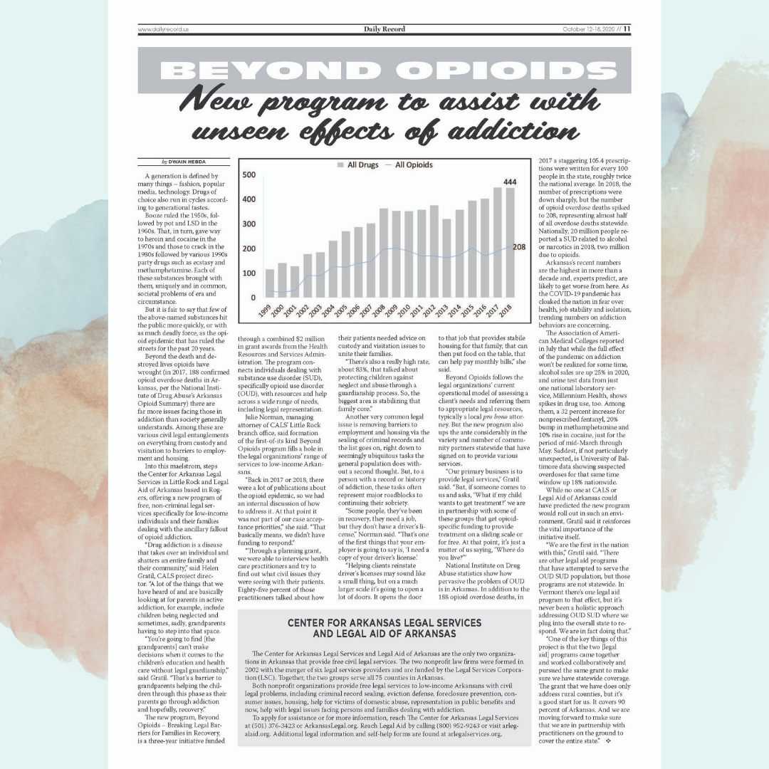 Getting a job, paying rent and other matters can be difficult after struggles with opioid abuse that might have included legal difficulties, which creates long-term issues for individuals who are trying to get or stay sober. The Center for Arkansas Legal Services and Legal Aid of Arkansas have launched a new program called Beyond Opioids to provide free legal assistance to families who have been affected by the opioid epidemic.