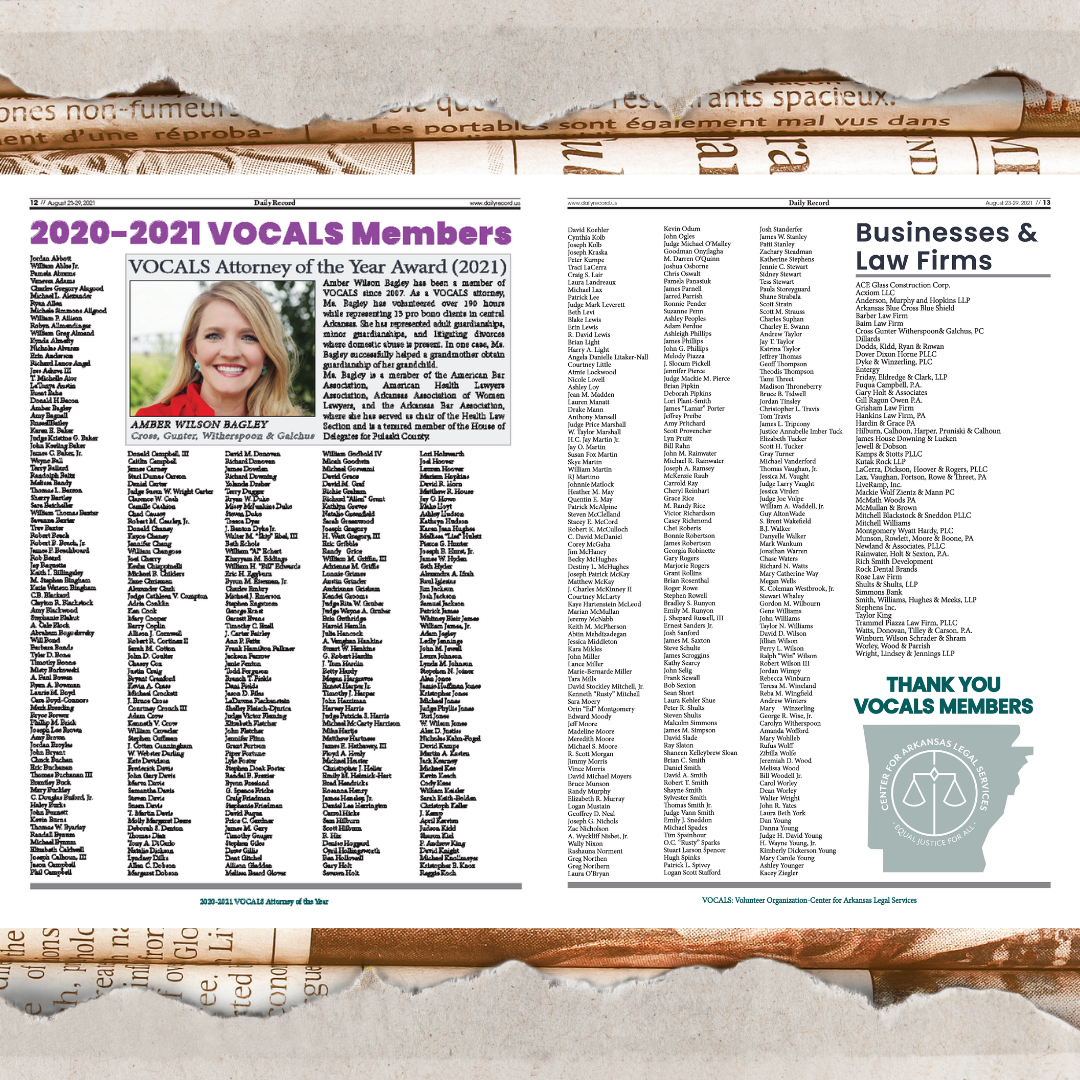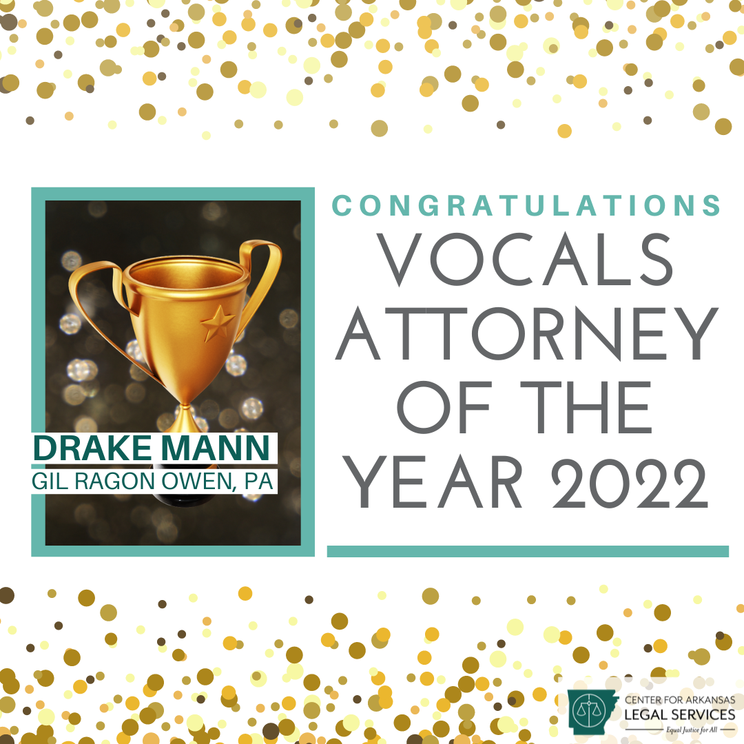 Karie Bryan was the first recipient of the newly renamed Jean Turner-Carter VOCALS Attorney of the Year Award in May 2023. Karie has dedicated, in just the last year, pro bono services to multiple Arkansas Legal clients, providing dozens of hours of service, and using her legal skills to give them not only legal services but hope for the future. Karie represents the new generation of attorneys in our central Arkansas legal community who want to give back, particularly through volunteering as a VOCALS member. She’s a role model for all of us.