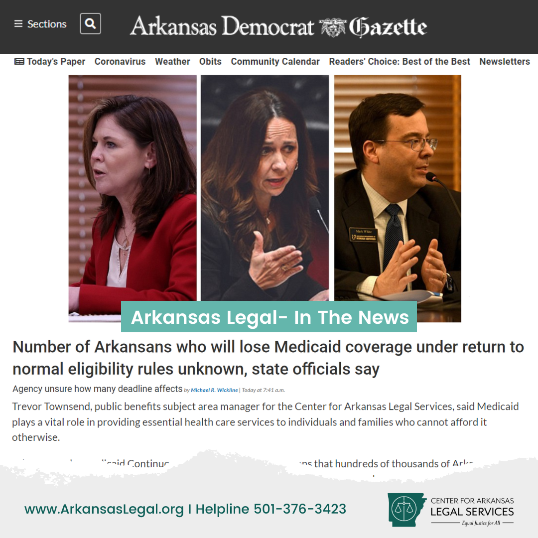 "This will be a massive undertaking; therefore, it is legally essential for the State to provide adequate notice to Medicaid beneficiaries of any intended adverse action it intends to take," he said. "Previous litigation on Medicaid has made it clear that these due process rights are fundamental and must be specifically followed. Every person has the right to due process, which means if Arkansans have been denied Medicaid due to this change, they have a right to challenge the denial in a fair hearing. Our staff is here to immediately help Arkansans if they receive a redetermination or denial letter through our dedicated helpline ..."