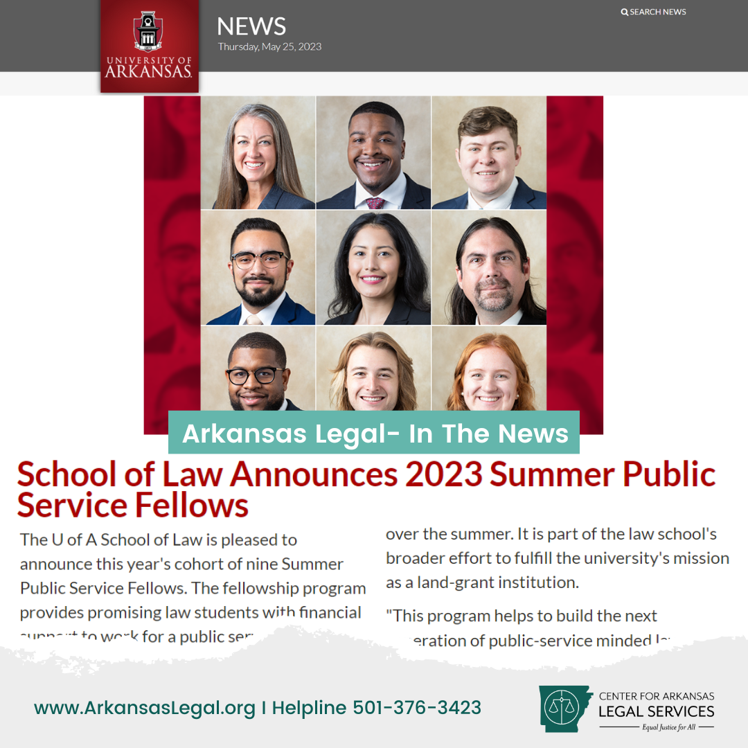 The U of A School of Law is pleased to announce this year's cohort of nine Summer Public Service Fellows. The fellowship program provides promising law students with financial support to work for a public service employer over the summer. It is part of the law school's broader effort to fulfill the university's mission as a land-grant institution.