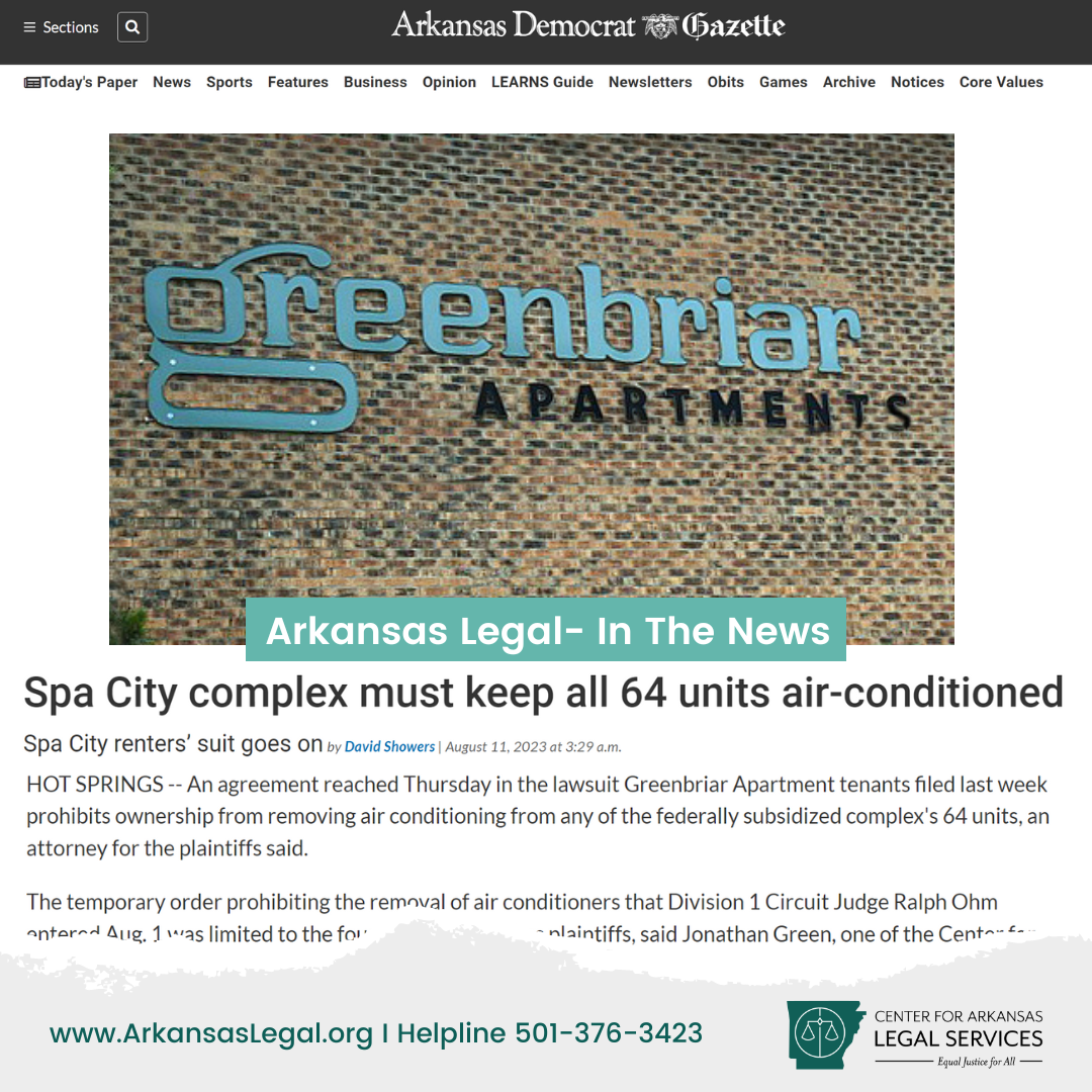 "Plaintiffs rely on their air conditioning units to shield them from the excessive heat of summer," attorneys from the Center for Arkansas Legal Services said in the motion they filed on behalf of plaintiffs and Greenbriar tenants David Bell, Elberta Crouch, Crystal Todd and Keishon Hicks.